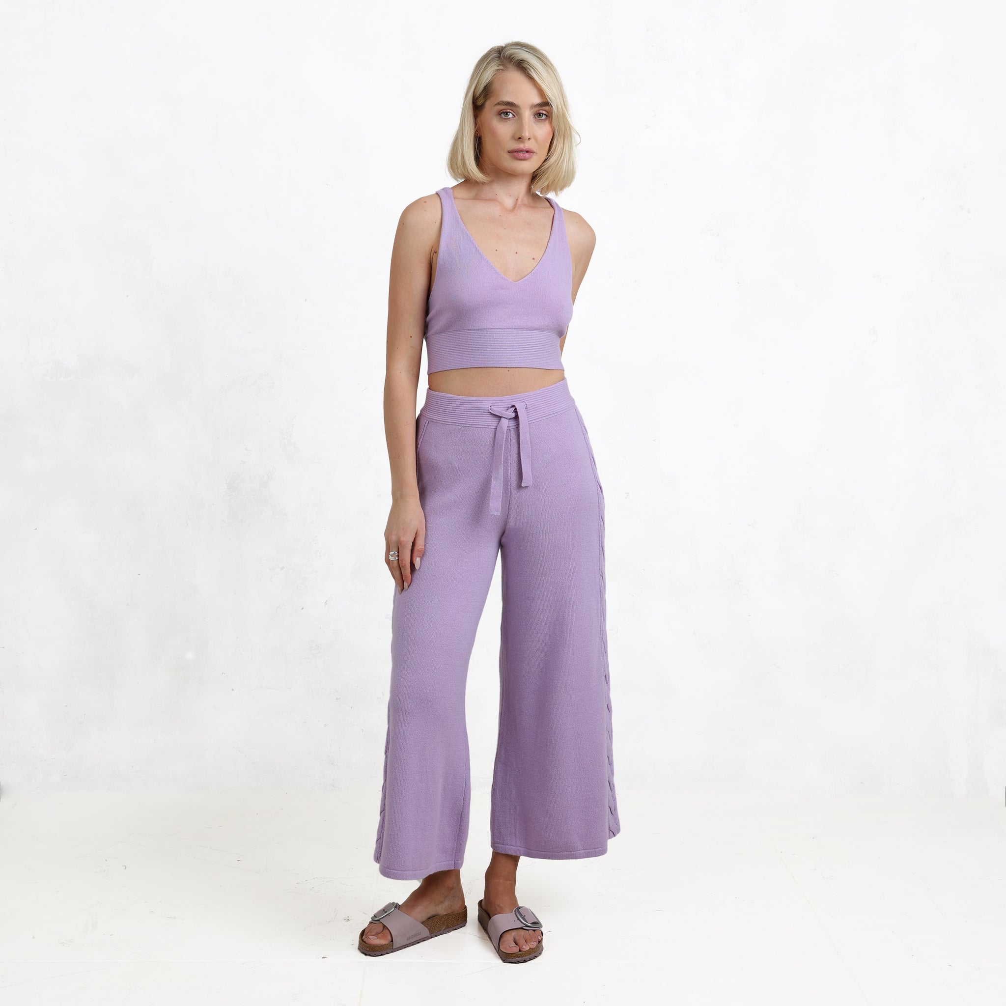 Erica track pants are great for lounging at home and casual days out alike. They have a ribbed waistband with adjustable ties and a relaxed silhouette enhanced by wide legs. Wear yours with our Cleo cardigan and/or Georgia bra top.
